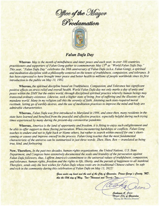 ![]() 圖:馬裏蘭州格蘭納爾登市 (Mayor of Glenarden, Maryland) 市長卡申納﹒克羅斯(Cashenna A. Cross)簽發褒獎令,為法輪大法送上最美好的祝福。 |