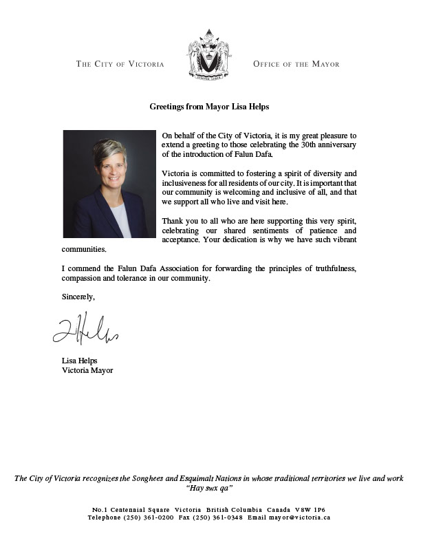 我很榮幸地代表維多利亞市向慶祝法輪大法洪傳30週年的人們致以問候。