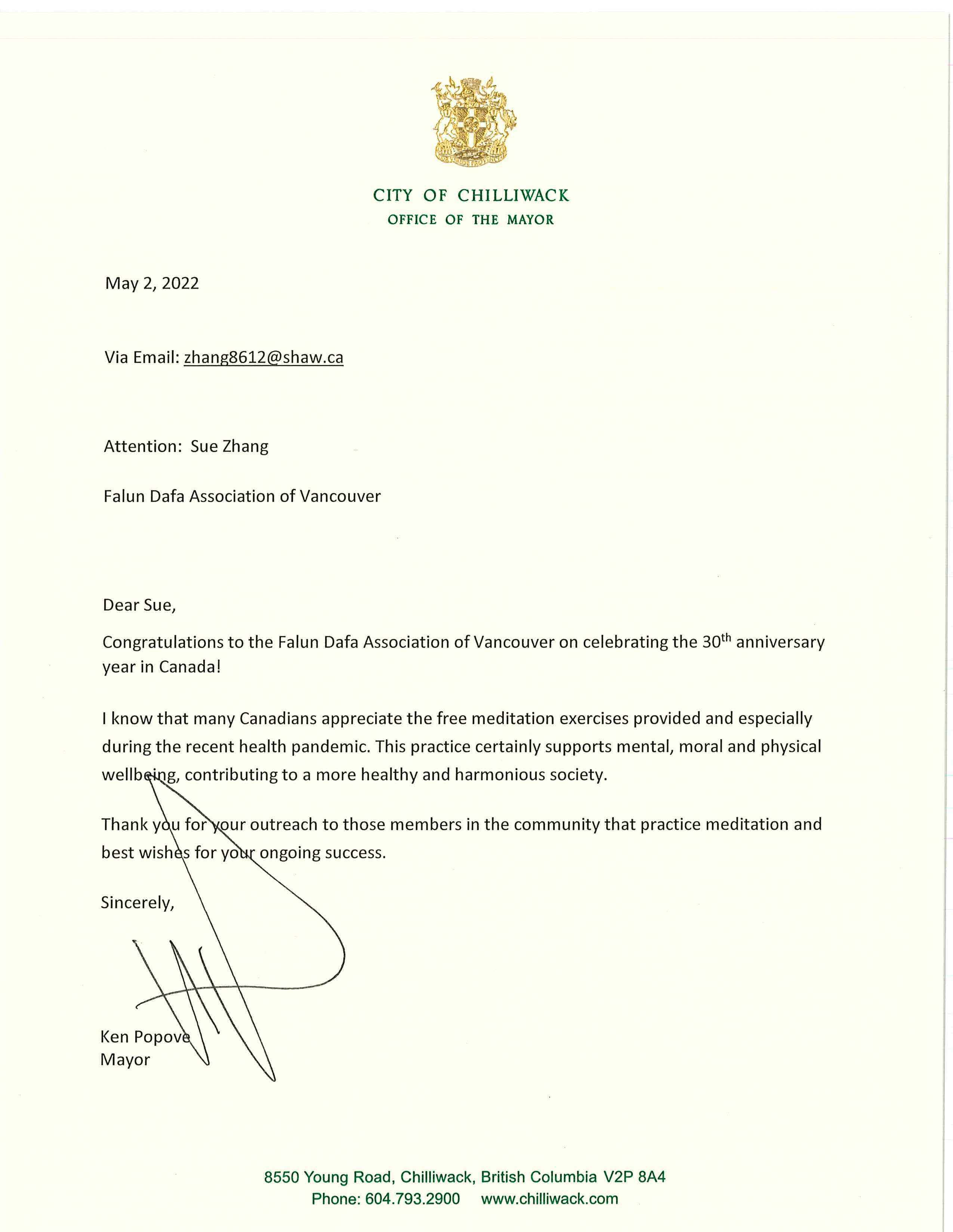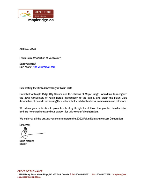 二零二二年四月十九日,楓樹嶺市(Maple Ridge)市長麥克﹒莫登(Mike Morden)發來賀信,賀信中寫道: