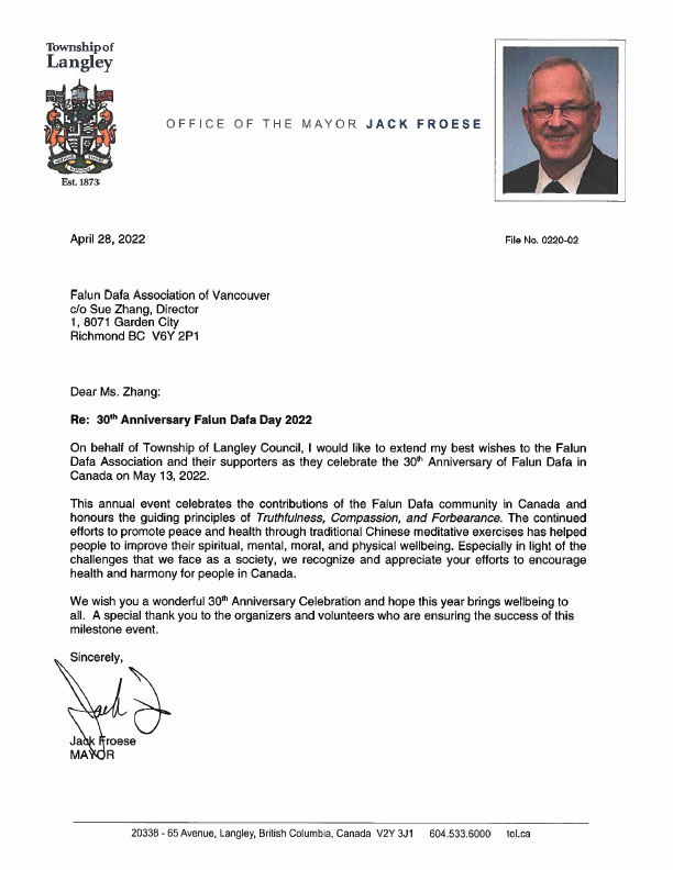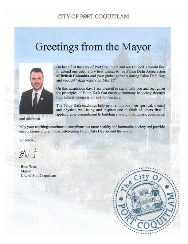 我謹代表楓樹嶺市議會和楓樹嶺市民,感謝法輪大法洪傳於世三十週年,並向加拿大法輪大法協會深表謝意,感謝你們與我們分享真、善、忍的價值觀。