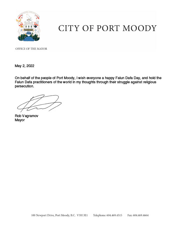 值此五月十三日法輪大法日和法輪大法洪傳30週年紀念日到來之際,我謹代表高貴林港市和市議會,向溫哥華法輪大法協會和你們在全球的同仁致以最誠摯的祝福!