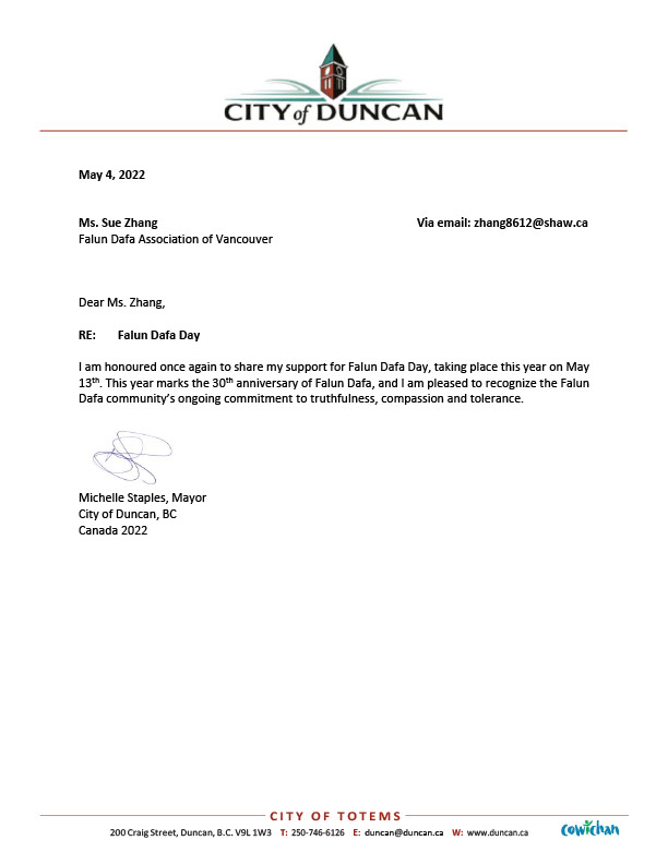鄧肯市(Duncan)市長米歇爾﹒史泰博(Michelle Staples)賀信譯文如下: