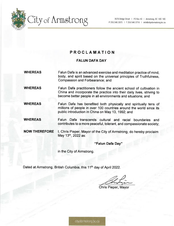 我,克里斯.皮珀(Chris Pieper),阿姆斯特朗市(Armstrong)市長特此宣布:2022年5月13日為阿姆斯特朗市「法輪大法日」。