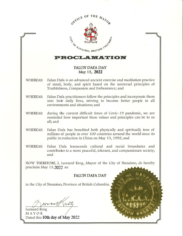 我,倫納德.克羅格(Leonard Krog),納奈莫市(Nanaimo)市長特此宣布:2022年5月13日為納奈莫市「法輪大法日」。