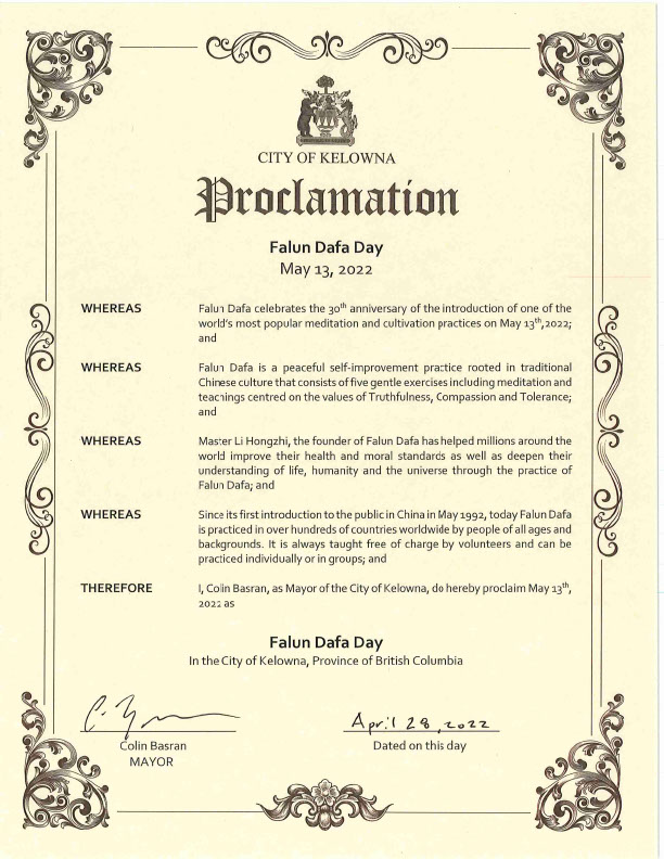 為此,我,科林.巴索隆,基隆納市(Kelowna)市長宣布:二零二二年五月十三日為卑詩省基隆納市法輪大法日。