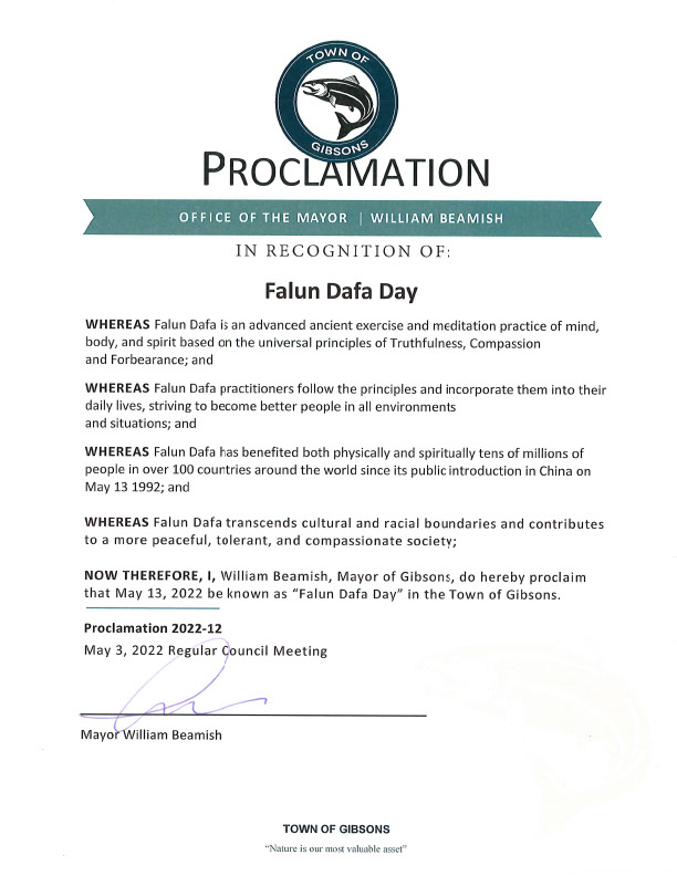 我,威廉﹒比米詩(William Beamish),吉布森鎮(Town of Gibsons)市長,特此宣布:二零二二年五月十三日為「法輪大法日」。