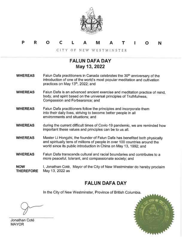 我,喬納森﹒科特,新西敏市市長,特此宣布:二零二二年五月十三日為新西敏市「法輪大法日」。
