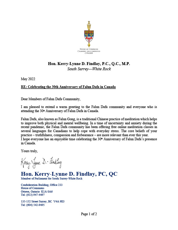 南素裏-白石鎮選區國會議員馮傑妮(Kerry-Lynne Findley)在賀信中寫道:「我很高興地向法輪大法團體和所有參加加拿大法輪大法30週年紀念活動的人致以熱烈的問候。疫情期間,在充滿不確定性和焦慮的日子裏,法輪大法團體為加拿大人提供了多種語言的免費在線教功課程,幫助人們應對每天的壓力。今年,你們的核心信仰──真、善、忍比以往任何時候都更有意義。」