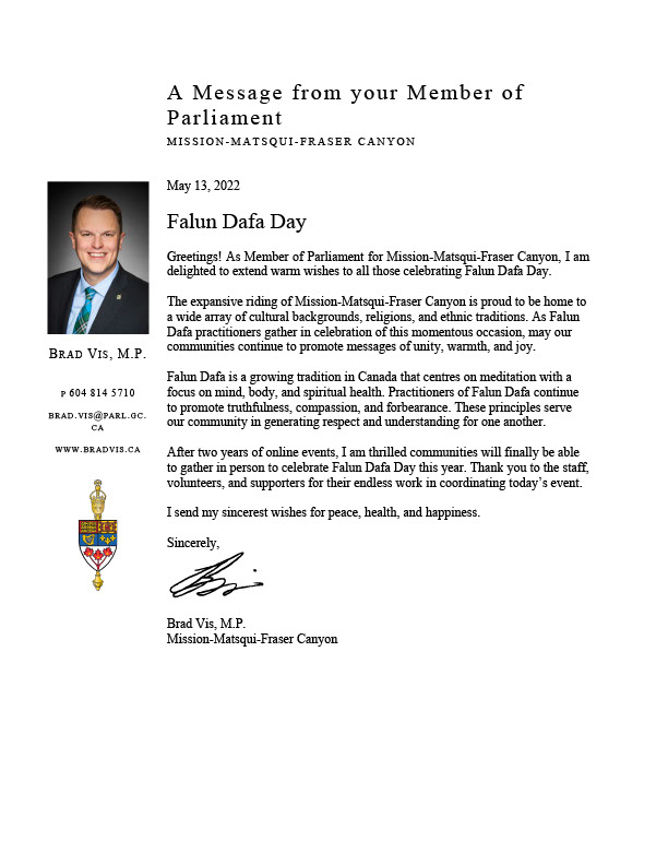 卑詩省米遜-馬茲奎-菲沙坎農選區(Mission-Matsqui-Fraser Canyon)國會議員布拉德﹒維斯(Brad Vis)在賀信中表示:「我很高興向所有慶祝法輪大法日的人致以誠摯的問候。法輪大法是一種傳統的修煉方法,注重心靈、身體與精神健康,在加拿大廣為流傳。法輪大法修煉者持之以恆地弘揚真、善、忍,這些理念有助於我們的社區相互尊重、相互理解。」
