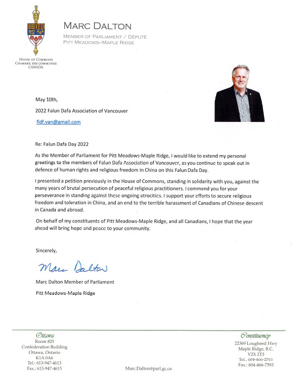 皮特草原-楓樹嶺選區國會議員馬克﹒道爾頓(Marc Dalton)在賀信中寫道:「值此法輪大法日之際,特向溫哥華法輪大法協會的各位成員致以我個人的問候,因為你們從不間斷地在為捍衛中國人的人權和宗教自由而大聲疾呼。