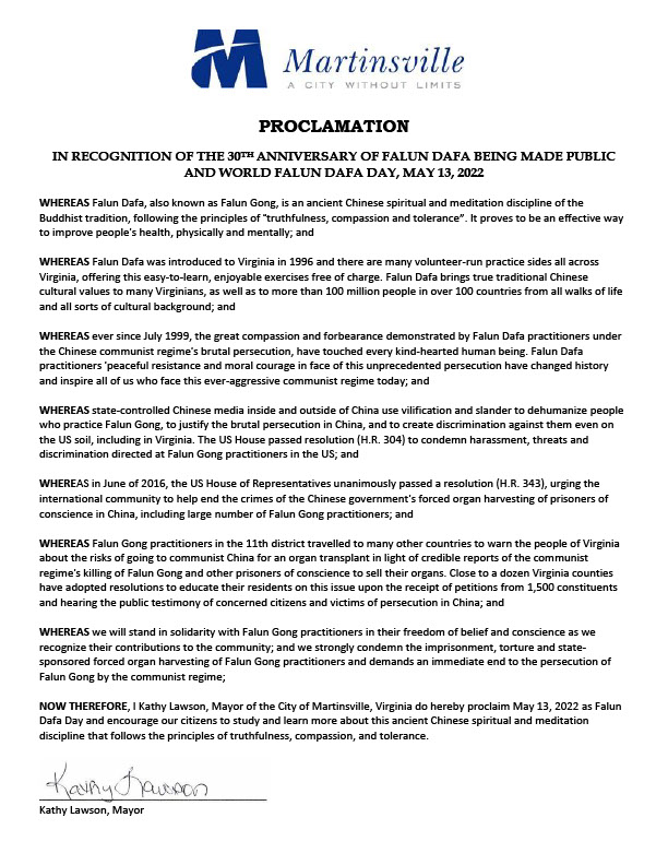 ![]() 圖:弗吉尼亞州馬丁斯維爾市褒獎「五一三」法輪大法日 |