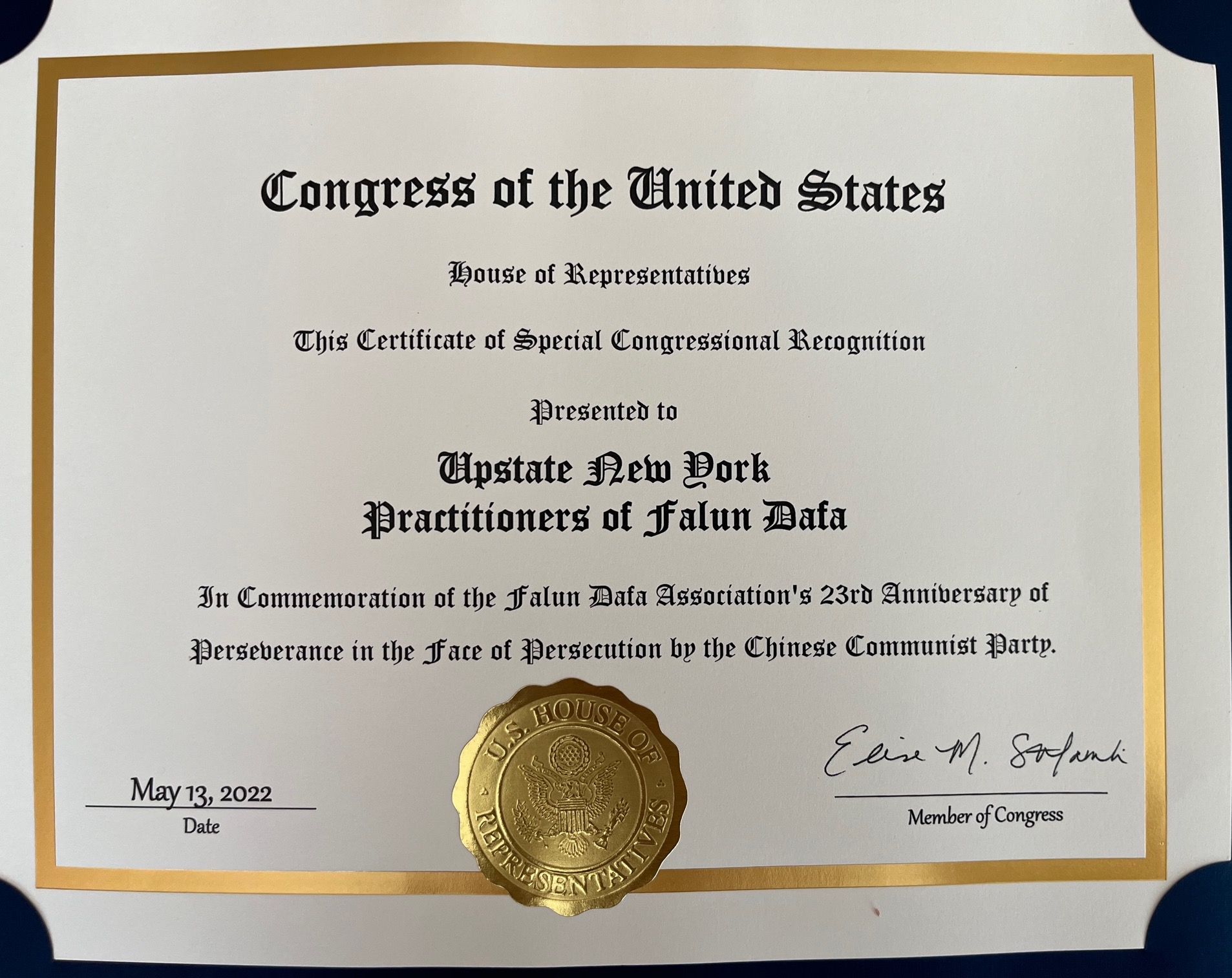 ![]() 圖2:紐約州第二十一選區聯邦眾議員、眾議院共和黨會議主席埃莉斯﹒斯特凡尼克(Elise Stefanik)向紐約上州法輪大法修煉者頒發了美國國會特別褒獎令,「以紀念法輪大法團體在中共迫害下堅守二十三週年」。 |