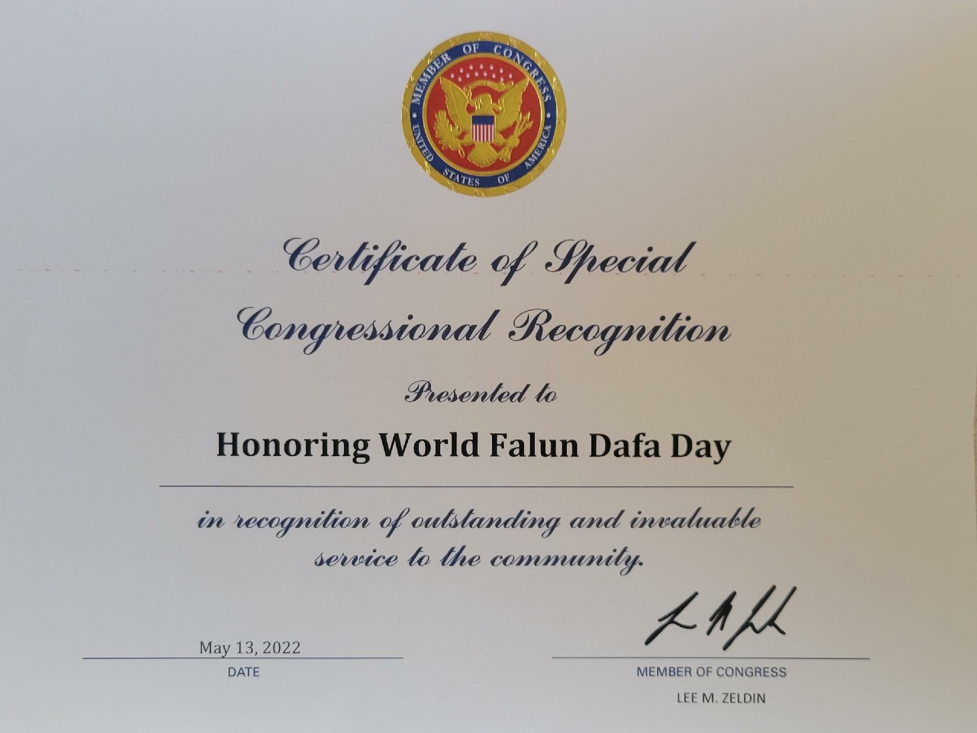 ![]() 圖4:紐約州第一選區聯邦眾議員李﹒澤爾丁(Lee M. Zeldin)頒發美國國會特別褒獎令,「慶賀世界法輪大法日,表彰其對社區的傑出與無價的貢獻」。 |