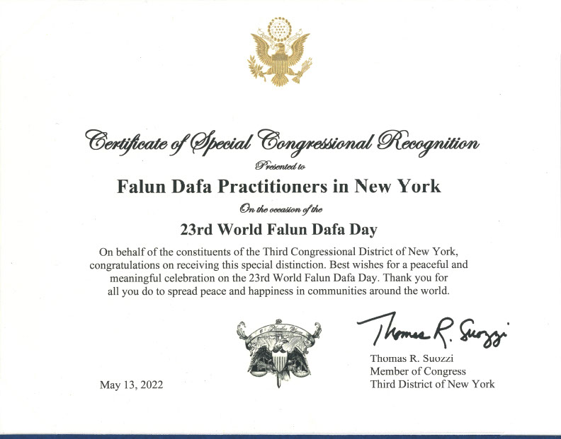 多年來,法輪大法成為許多人生活中不可或缺的、正面的部份。他不僅傳播廣泛,而且對我們的社會起到的作用是觸手可及的。為紐約人,以及世界各地人們生活的繁榮,提供各種必須的條件至關重要,所以讓我們來共同慶祝,並對法輪大法創始人李洪志先生表示感謝。