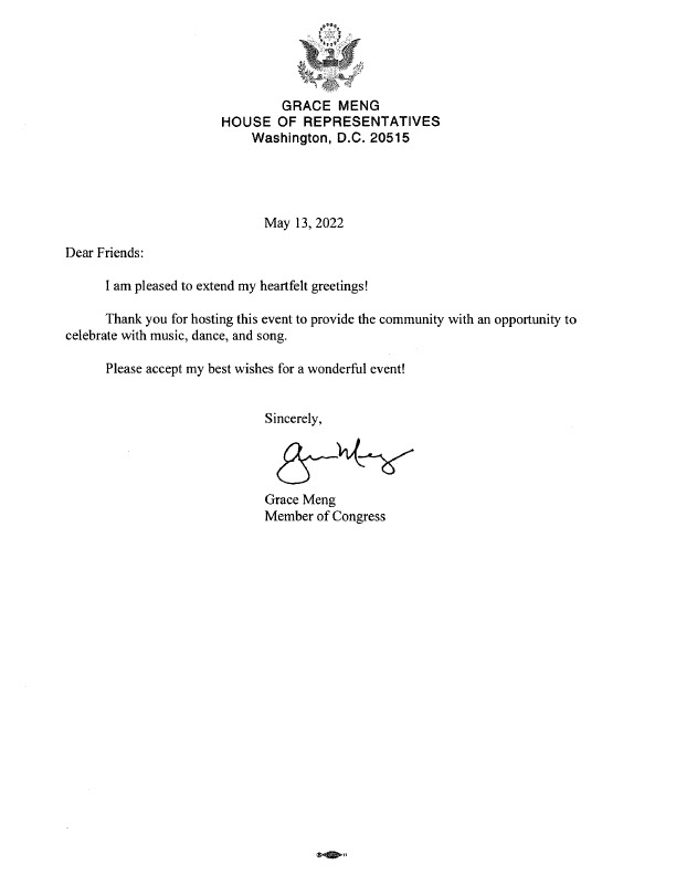 ![]() 圖7:紐約州第六選區聯邦眾議員孟昭文(Grace Meng)在賀信中說,「我很高興向你們表示衷心的問候。感謝你們舉辦這次活動,為社區提供了一個用音樂、舞蹈和歌曲來慶祝的機會。請接受我最良好的祝願。」 |