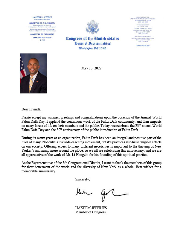 ![]() 圖8:紐約州第八選區聯邦眾議員哈基姆﹒傑弗里斯(Hakeem Jeffries)發來賀信,祝賀世界法輪大法日。 |