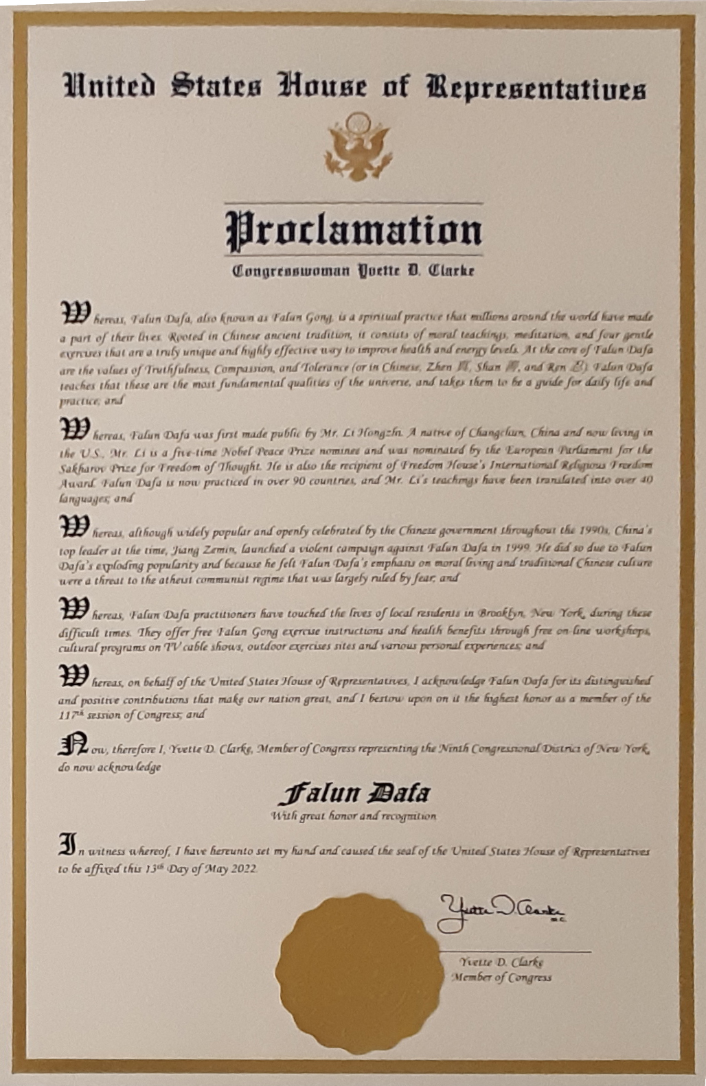 紐約州第九選區聯邦眾議員伊薇特﹒克拉克(Yvette D. Clarke)在褒獎令中說,「我代表美國眾議院,感謝法輪大法為使我們的國家偉大而做出的非凡而積極的貢獻,並授予他作為第117屆國會議員的最高榮譽。我現在代表紐約州議會第九選區的國會議員,授予法輪大法最高榮譽。」