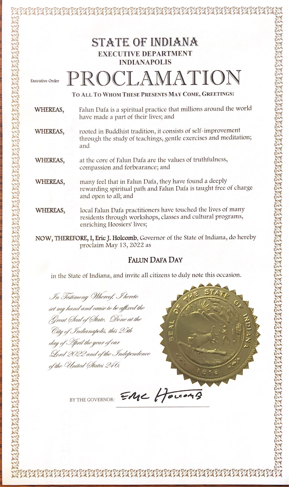 因此,我,埃瑞克﹒霍科姆(Eric Holcombe),印第安那州州長,在此宣布二零二二年五月十三日為法輪大法日。