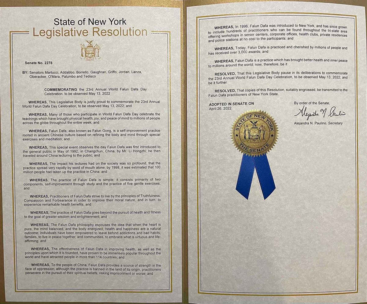 二零二二年四月二十六日,美國紐約州參議會全體通過第J2278號決議案,恭賀「二零二二年五月十三日,第二十三屆世界法輪大法日的慶典」。這是紐約州參議院第十年通過決議案,表彰「世界法輪大法日」。決議案由紐約州第四十二選區參議員麥克﹒馬圖奇(Mike Martucci)發起,十個參議員共同簽署贊成。