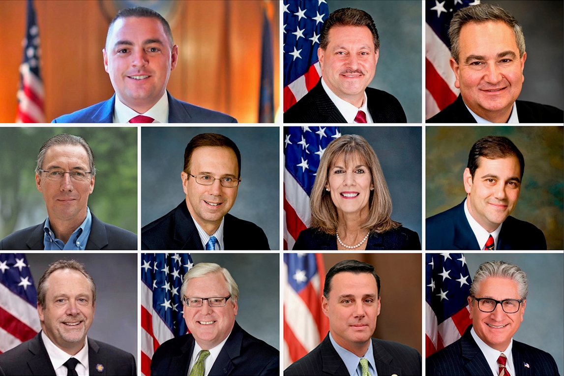 圖2:發起及共同發起恭賀二零二二年五月十三日第二十三屆「世界法輪大法日」決議案的紐約州參議員。第一行從左至右:發起人馬圖奇(Mike Martucci)、小阿達博(Joseph P. Addabbo Jr)、博雷洛(George M. Borrello); 第二行從左至右:高蘭(James Gaughran)、格裏夫(Joseph A.Griffo)、喬丹(Daphne Jordan)、蘭薩(Andrew J. Lanza);第三行從左至右:奧伯拉克(Peter Oberacker)、歐瑪拉(Thomas F. O'Mara)、帕倫博(Anthony H. Palumbo)、特地斯科(James Tedisco)