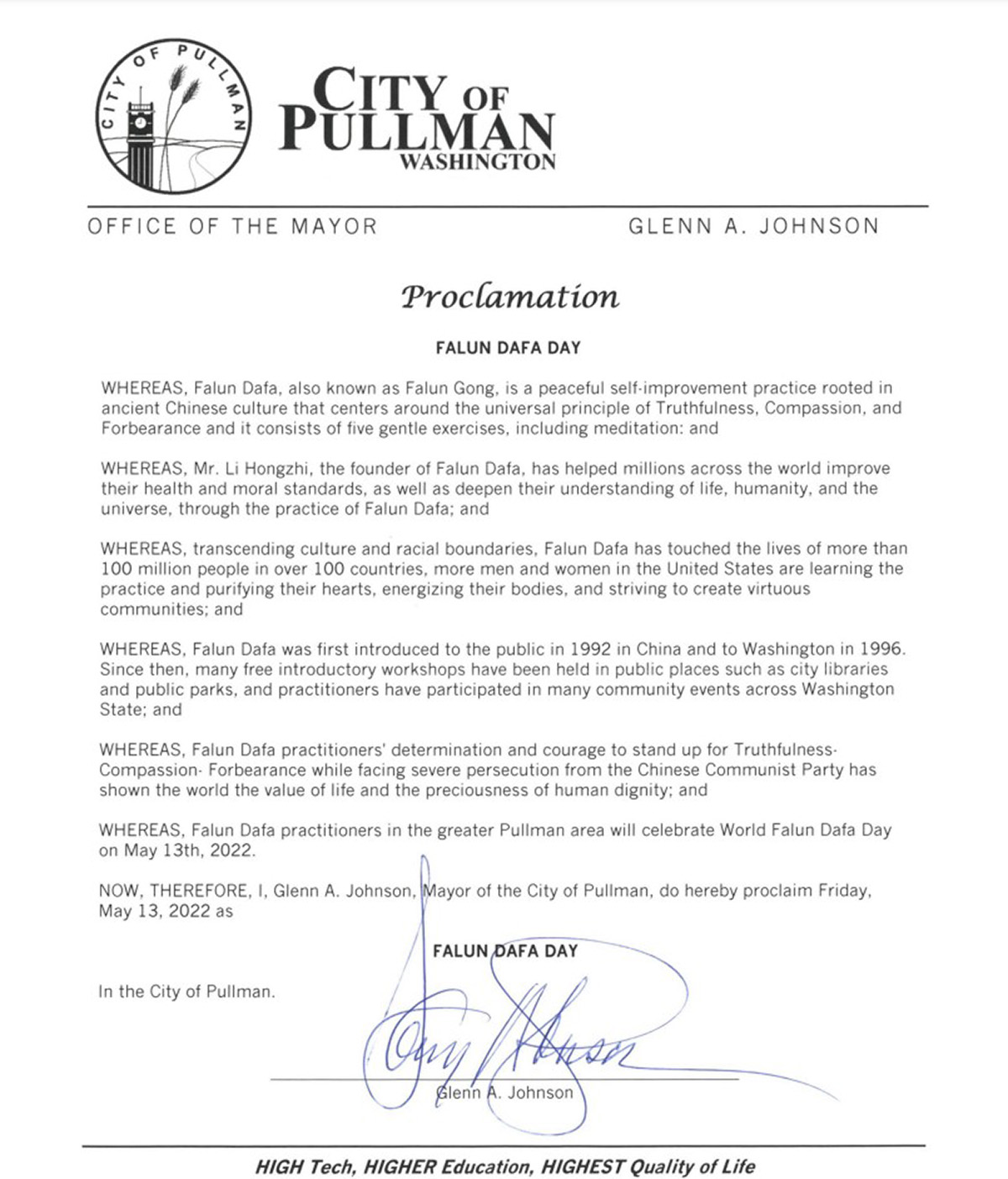 我,普爾曼市市長Glenn A. Johnson特此宣布,二零二二年五月十三日星期五為普爾曼市法輪大法日。」