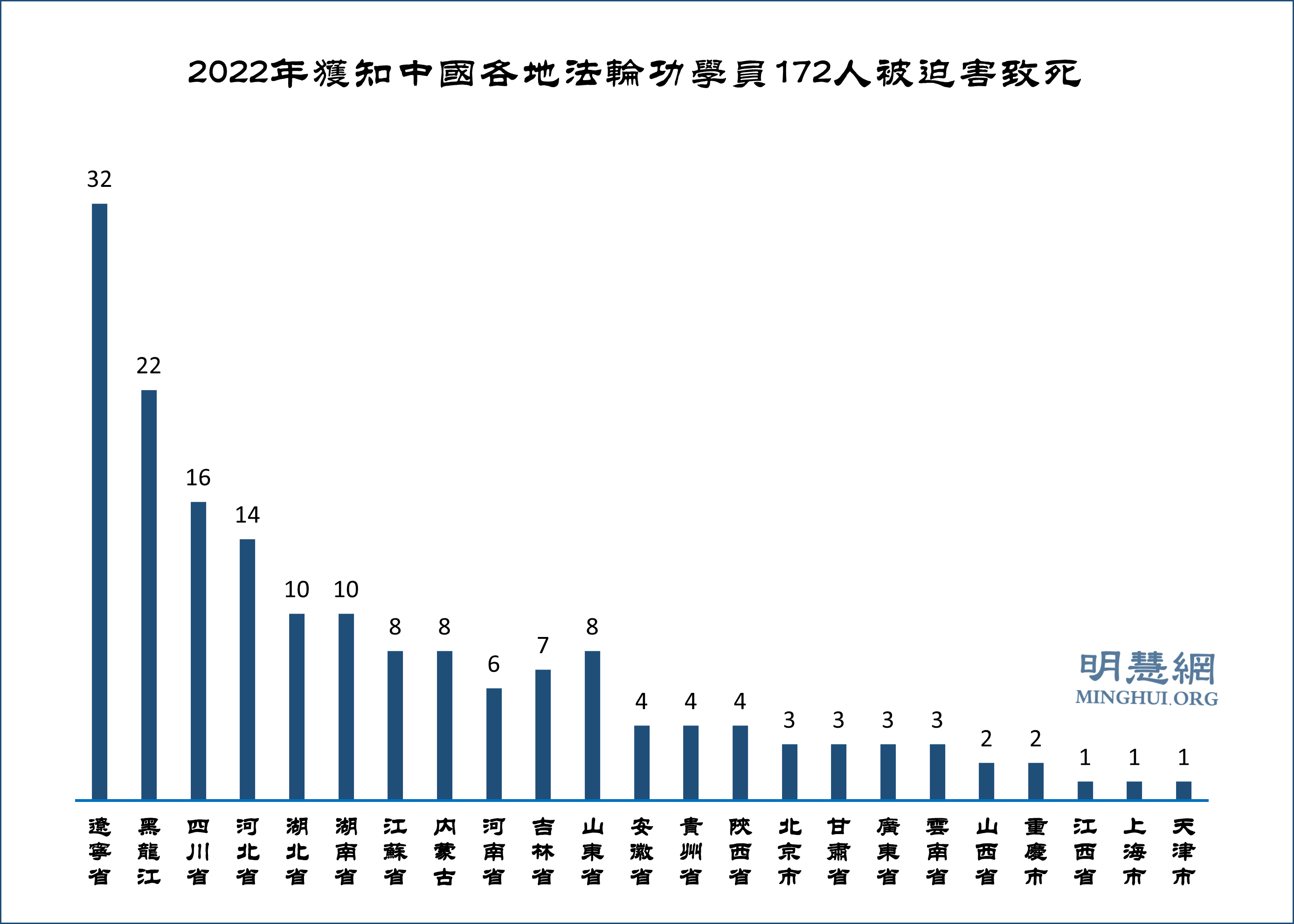 ![]() 2022年獲知中國各地法輪功學員172人被迫害致死 |