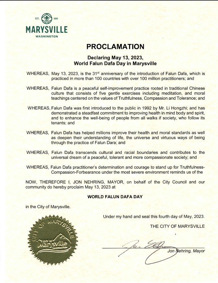 因此,我,馬里斯維爾市市長喬恩﹒裏弗林(Jon Nehring),代表市議會和我們的社區,特此宣布,二零二三年五月十三日為馬里斯維爾市法輪大法日。
