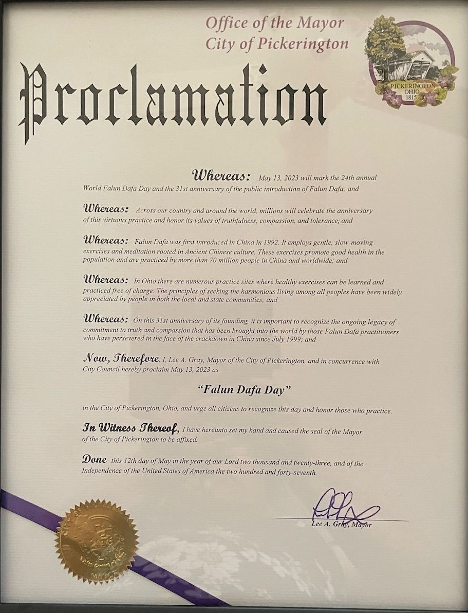 並敦促所有俄亥俄州,皮克瑞敦市市民紀念這一天並向那些修煉法輪大法的人們致敬。