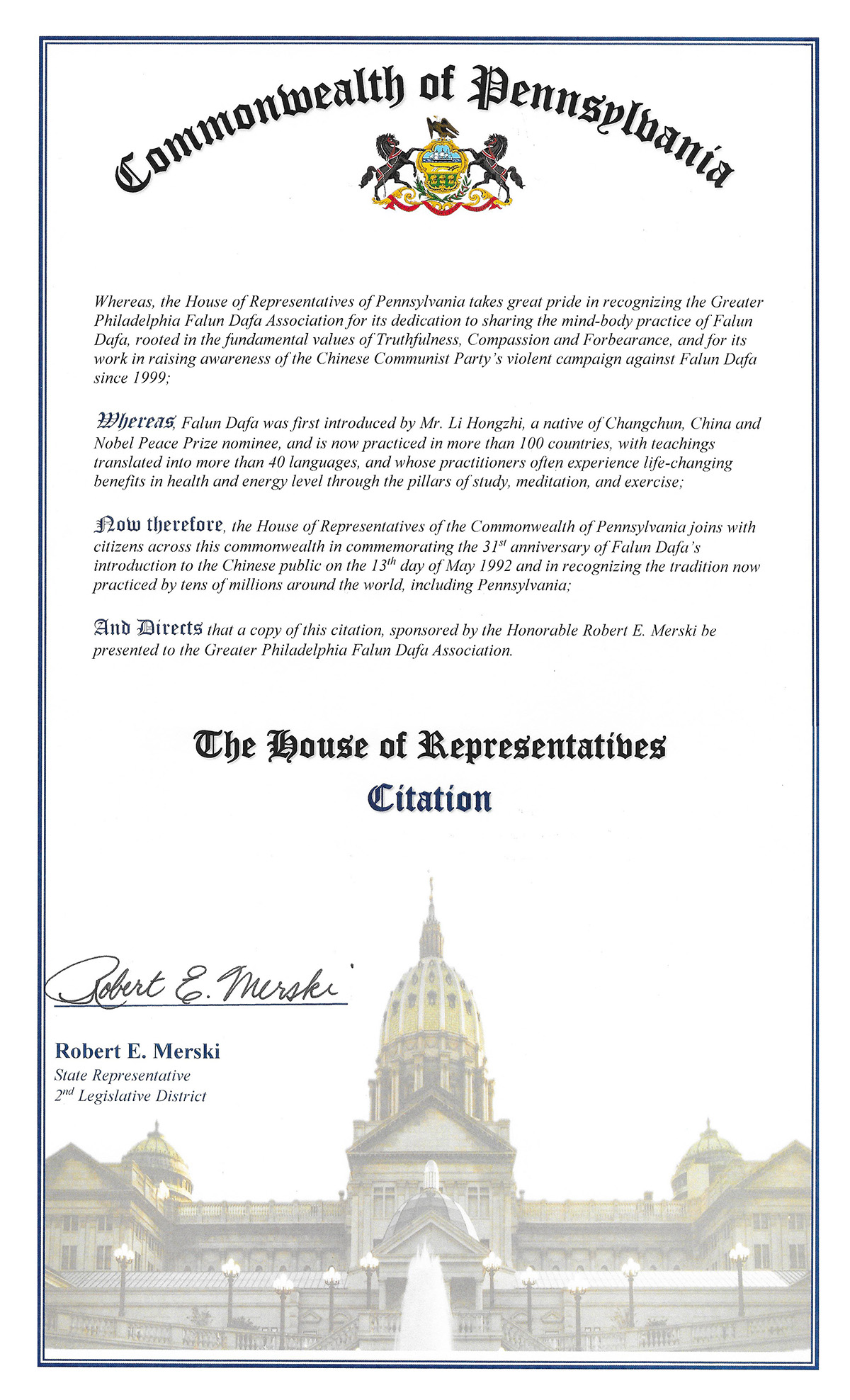 「賓州眾議院和全賓州民眾一起慶祝法輪大法自一九九二年五月十三日自中國傳世三十一週年,並認可這個被賓州和全世界上億人修煉的功法。」