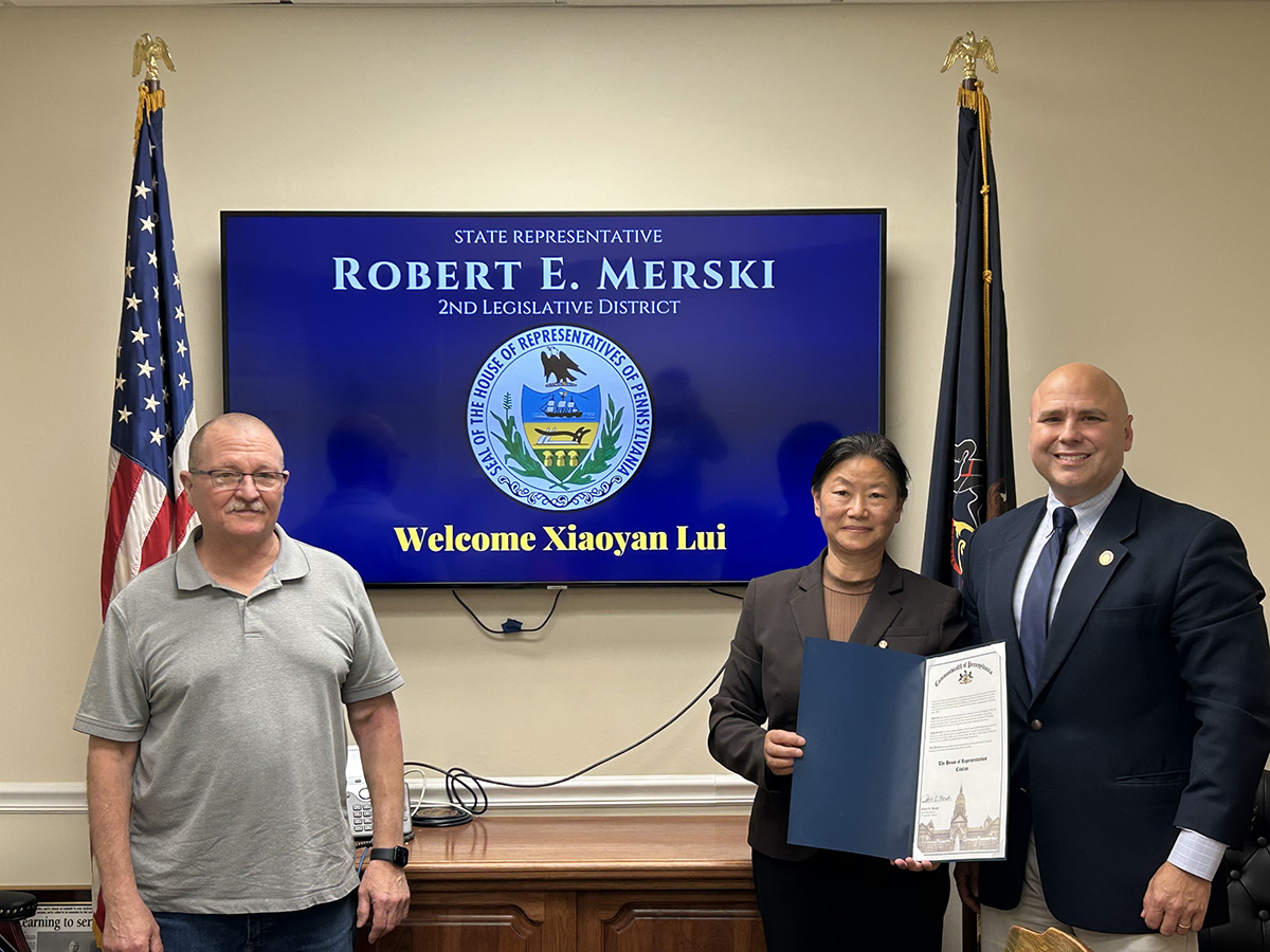 【明慧網二零二三年五月十五日】二零二三年五月十一日下午,賓州第二區眾議員羅伯特﹒默斯基(Robert E. Merski)邀請法輪功學員到他辦公室,他頒發褒獎狀慶祝世界法輪大法日,讚揚法輪大法弘傳世界一百多個國家,並表示很感興趣想學煉法輪功。