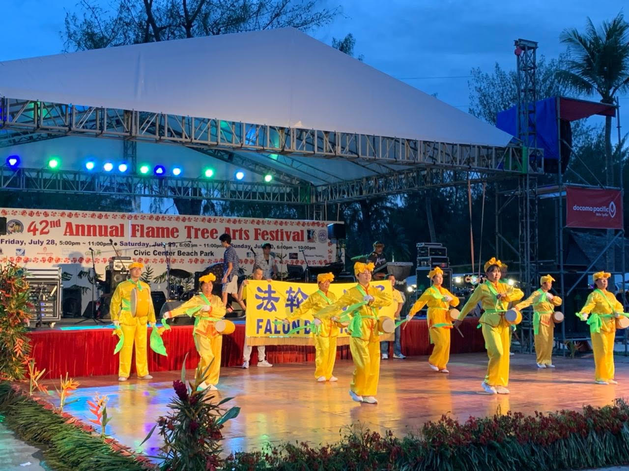 藝術節上,有法輪功學員組成的腰鼓隊表演了《法輪大法好》和《喜慶》等曲目,優美的旋律與節奏明快的鼓聲,贏得觀眾熱烈掌聲。主持人在現場介紹:法輪大法弘傳世界三十一週年,在歷次塞班島節日活動中,法輪功學員都積極參與支持,感謝法輪大法帶給我們的美好。