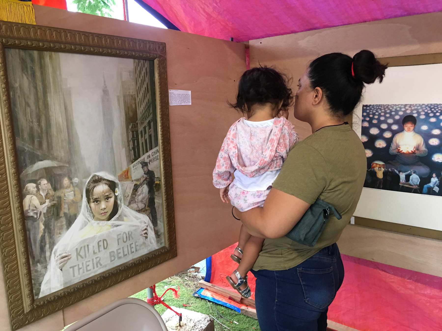 一位先生對《純真的呼喚》這幅作品很感興趣,學員向他介紹,法輪功學員在中國因信仰真、善、忍而被中共迫害,畫中的小女孩在風雨中靜靜地站立,雙手舉著「因堅守信仰被殺害」的展板,她雙眸明亮、表情堅毅、內心堅定,她的神情傳遞著她內心最純真的呼喚。她希望更多人明白真相, 世人的良知被喚醒,幫助迫害早日結束。最後,這位先生由衷地表達了他對法輪功學員的同情和敬佩,以及對中共迫害良善的厭惡。