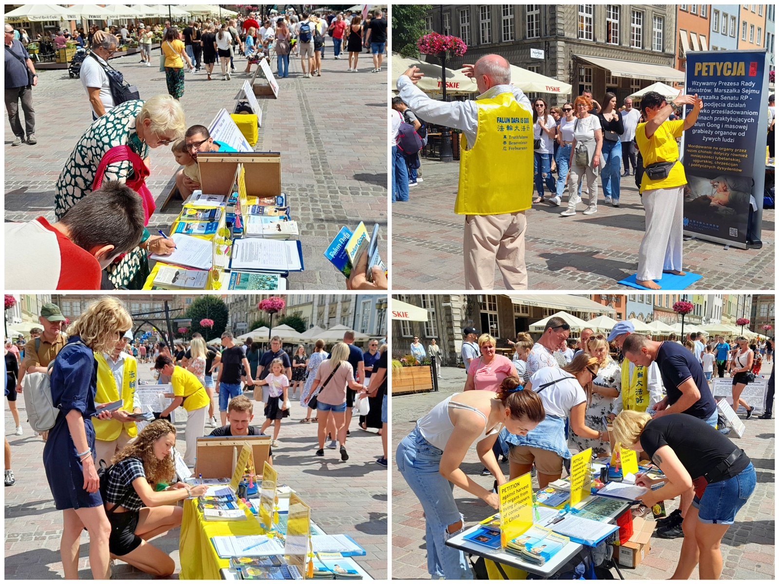 學員們在路中央擺放了一排醒目的海報和橫幅,還準備了中、英、德三種語言的真相資料,他們向路人散發真相傳單,並請民眾在呼籲波蘭政府幫助結束中共迫害的請願書上簽名。