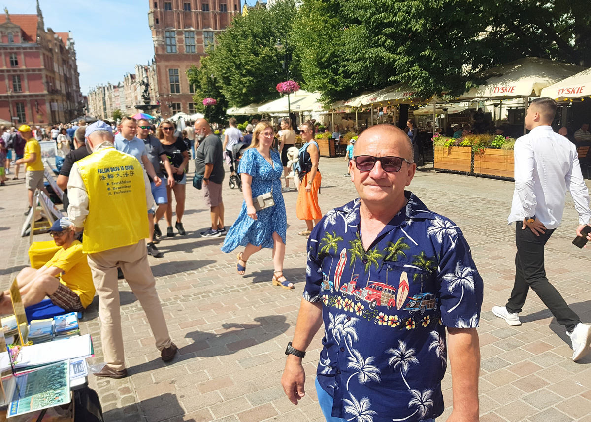 七月二十九日週六,上午十一點至下午六點,學員們在海王星噴泉附近集體煉功,平靜、慈悲、莊嚴的氛圍深深吸引了拉法爾﹒加迪安(Rafal Gardian),他停下來向學員了解法輪功的詳情。