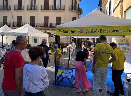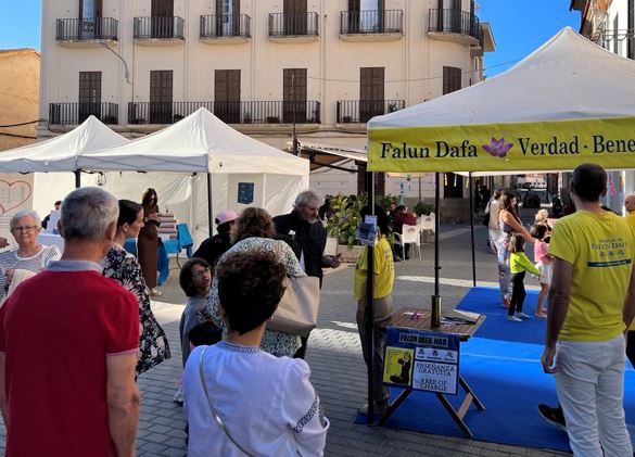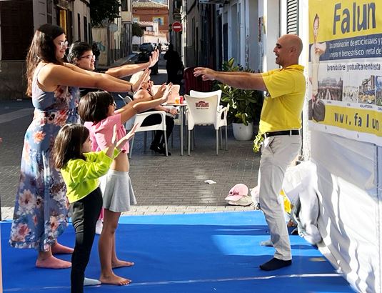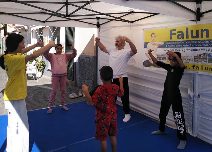 印卡是西班牙著名皮革之鄉,眾多西班牙皮革名牌源於此地。本次活動在安東尼﹒芙盧莎(Antoni Fluxà)廣場進行。秋季的馬略卡島依然陽光明媚,人們攜親帶友來到展會參觀。法輪功展位位於廣場臨街處,隨著煉功音樂響起,法輪功學員們開始展示法輪功五套功法。參觀者們被悠揚的音樂和優美舒緩的法輪功功法所吸引,紛紛駐足觀看,不斷有感興趣的當地人前來學功,並詢問煉功地點。孩子們也很喜愛這個來自東方的功法。