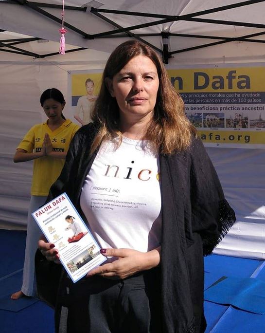 克勞迪婭(Claudia)女士來到展位,因為她好朋友的女兒在活動第一天經過法輪功展位,對音樂和學員煉功時展現的平靜印象深刻,這吸引了克勞迪婭也來到展位觀看。她說:「我剛過完生日,我想更平靜地對待生活。」 她當即和法輪功學員學煉功法。結束後,她說:「我發現煉功使我非常愉快,可以說非常舒暢。煉功散發出的能量讓我很平靜。另一個吸引我的是法輪大法真、善、忍的原則,我想同化真善忍。雖然我住的有點遠,但我還是打算來帕爾馬煉功點學功。」 她還表示她會與親朋好友分享了解到的大法信息。