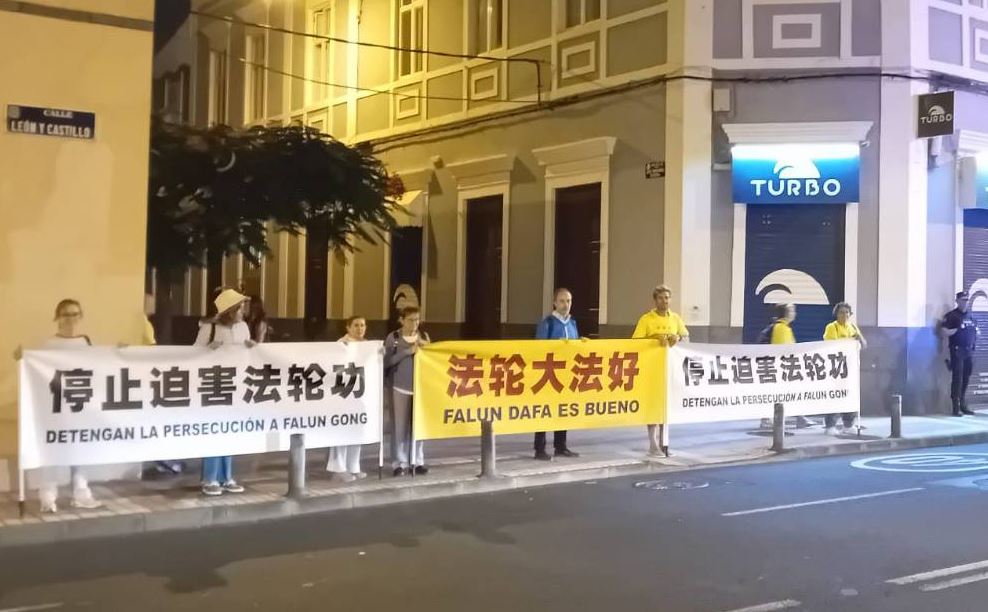 該地點人流不斷,一名中共安保人員要求西班牙警察驅逐法輪功學員。警察在查看了其身份證後對他說:「他們(指法輪功學員)沒有違反任何法律,他們可以留在這裏,西班牙是個自由的國家。」