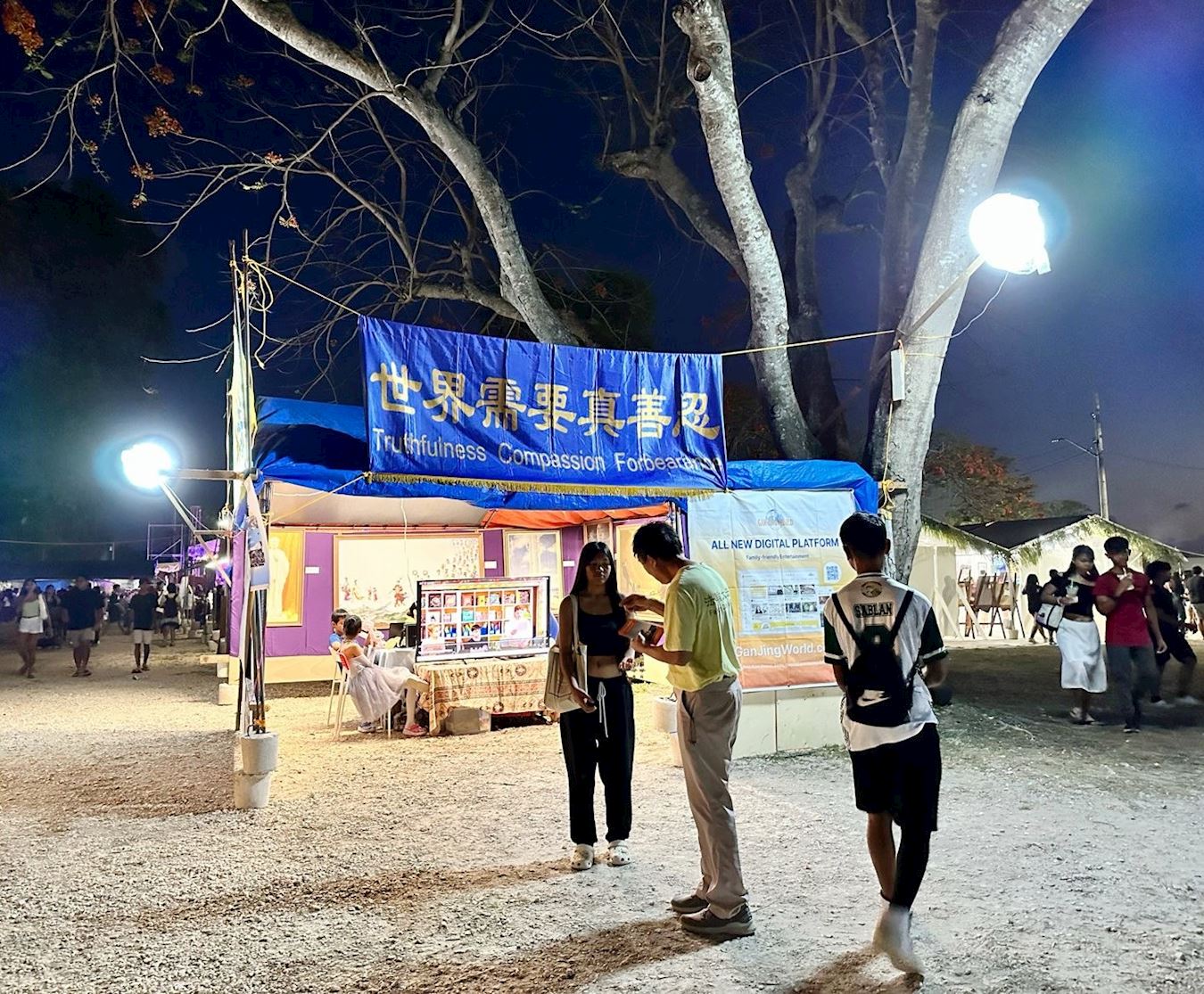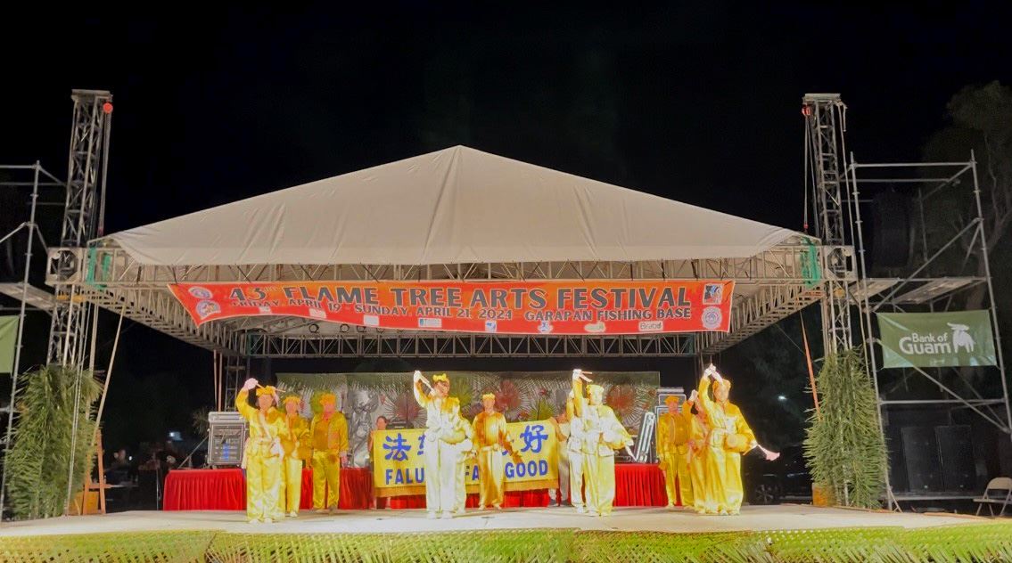 活動主持人特別向民眾介紹法輪大法,他說:「法輪功來到塞班已逾二十六年的歷史了,廣受民眾的喜愛。至今法輪大法已弘傳世界一百多個國家和地區。法輪大法學員希望借助火樹藝術節這個好日子裏,讓民眾體驗法輪大法的美好。」主持人說:「只有純淨的心靈和高尚的道德,才能帶來健康的身體和美好的人生。讓我們牢記法輪大法的真、善、忍。」