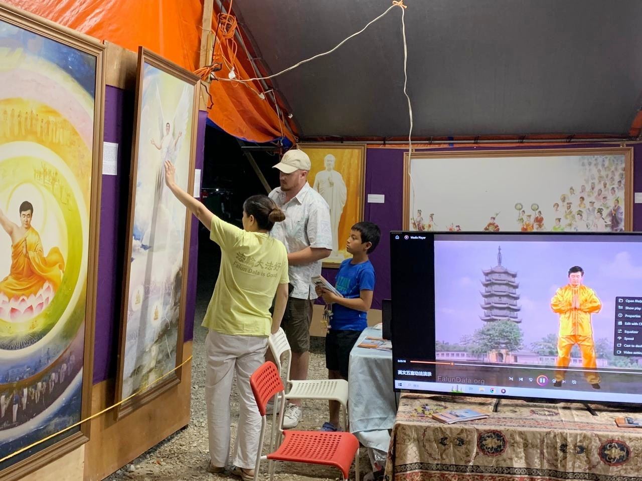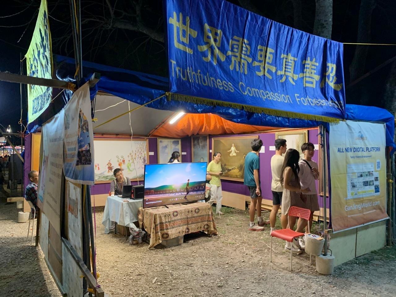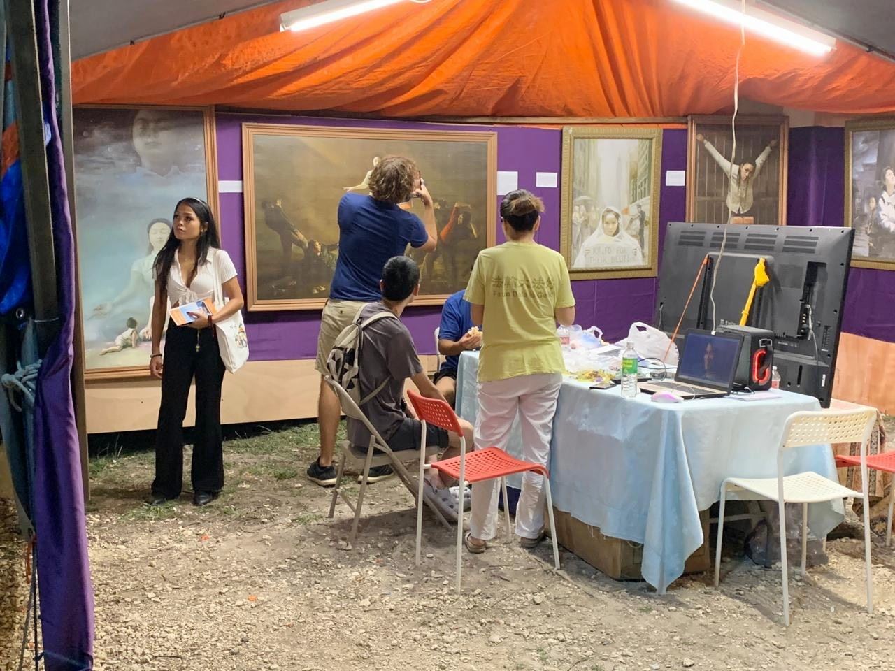 在活動中,法輪大法的展位很是醒目,首先映入眼簾的是展現法輪大法美好與真相的「真善忍美展」,充滿了藝術氣息和精神價值,有不少市民駐足欣賞,並拍照留念。這些作品是由修煉法輪功的藝術家創作的,畫作不但體現了精湛的藝術水平,畫家修煉的境界,讓他們的作品更能觸動人們的心靈,喚醒人們善良的本性和對生命歸真的美好嚮往。