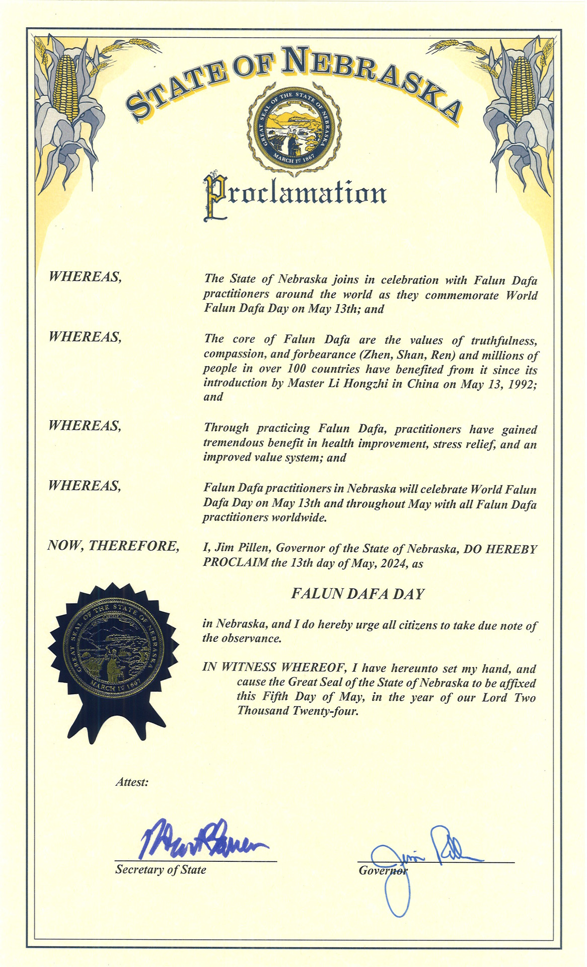 因此, 我吉姆﹒皮倫,內布拉斯加州州長,特此宣布,二零二四年五月十三日為內布拉斯加州「法輪大法日」。