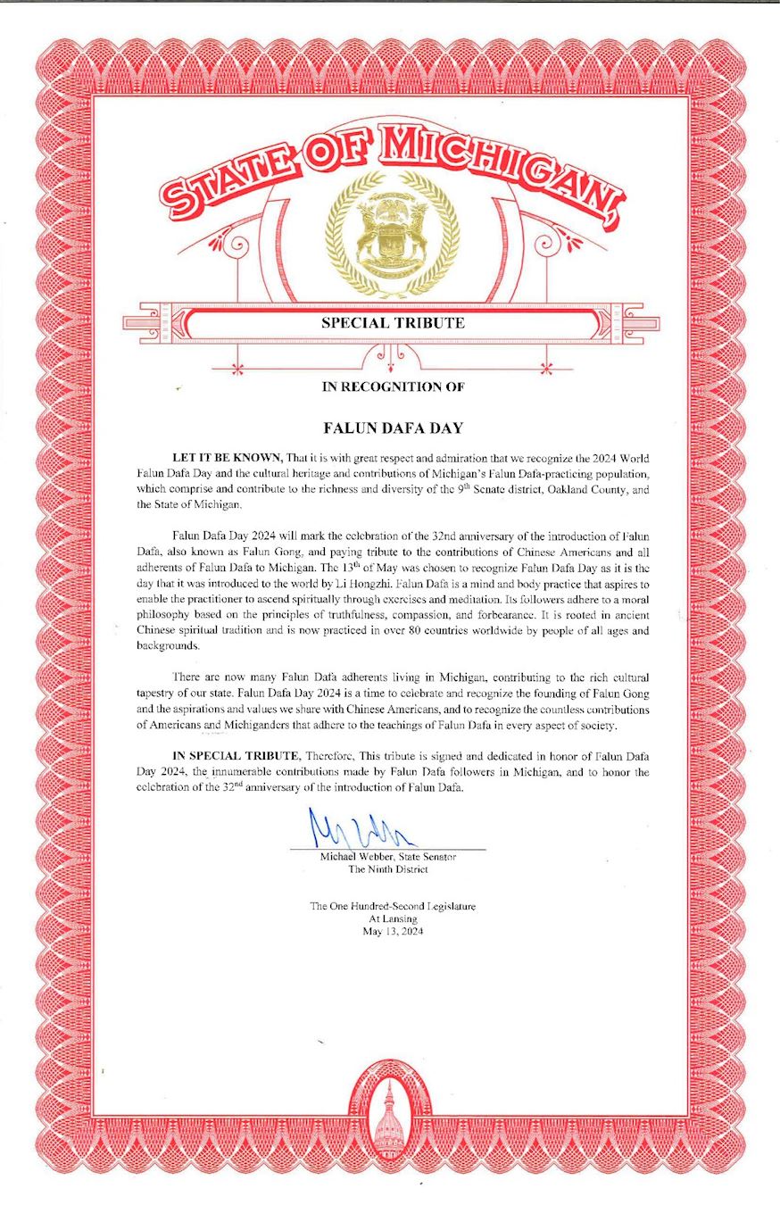 特別致敬,因此,謹此簽署並獻上此致敬文,以紀念二零二四年法輪大法日,感謝密西根州法輪大法弟子做出的無數貢獻,並慶祝法輪大法弘傳三十二週年。