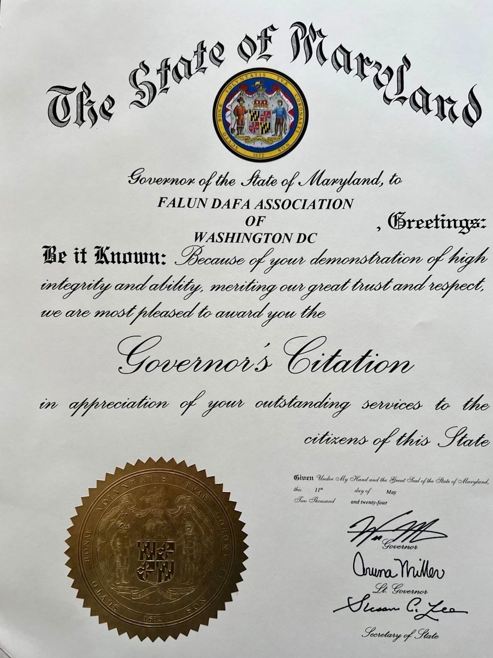 ![]() 圖1:在世界法輪大法日來臨之際,美國馬裏蘭州州長韋斯﹒摩爾(Wes Moore)向華盛頓DC法輪大法學會頒發州長嘉獎令。 |
