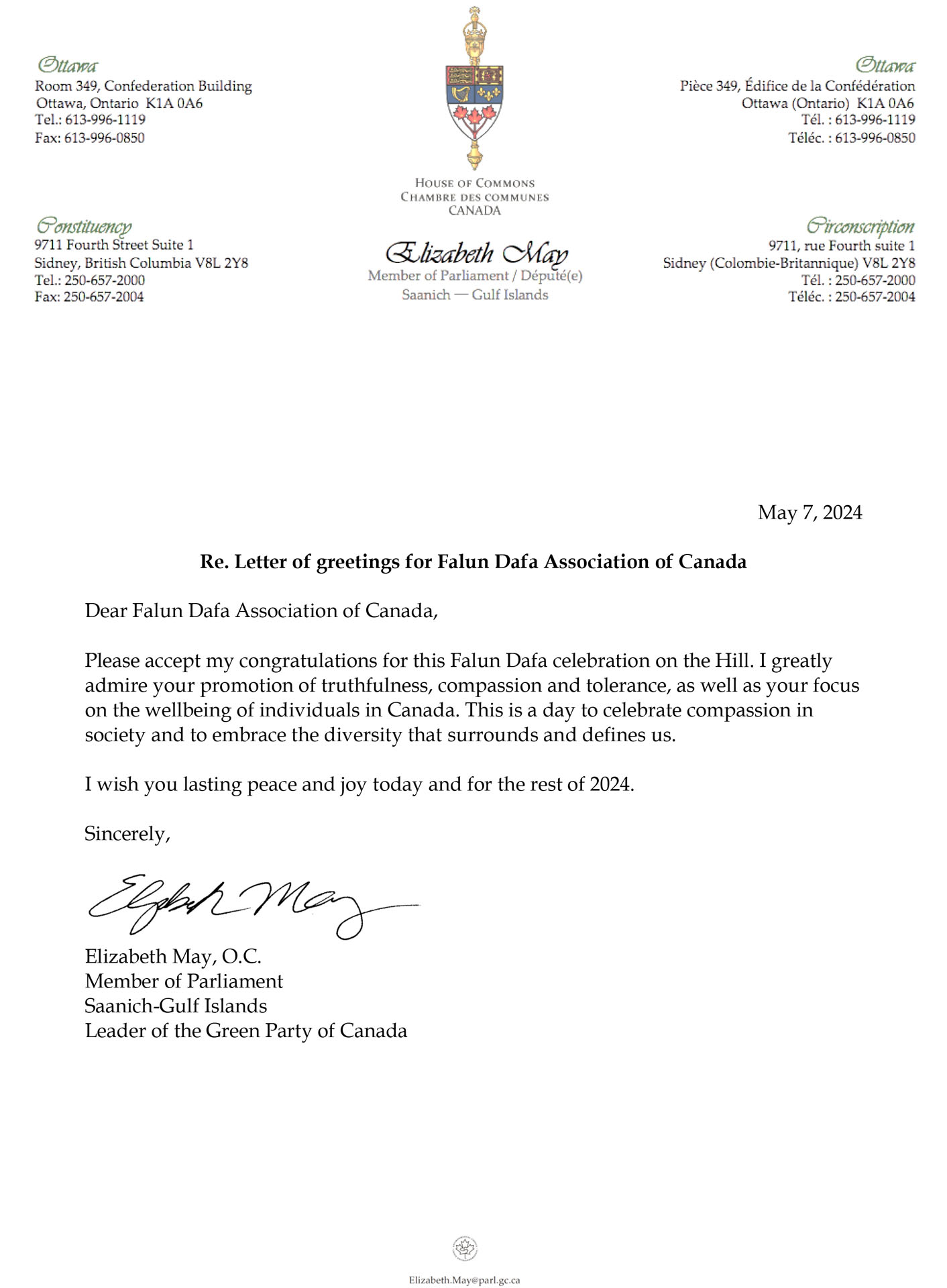 加拿大聯邦綠黨黨領、薩尼奇-海灣群島選區國會議員伊麗莎白﹒梅伊(Elizabeth May)在賀信中寫道:「請接受我在國會山對法輪大法日慶典活動的祝福。我非常欽佩你們推廣真、善、忍理念,以及你們對加拿大個人福祉的關注。今天是慶賀人們遵循善,並擁抱我們所處的多樣性社會的日子。