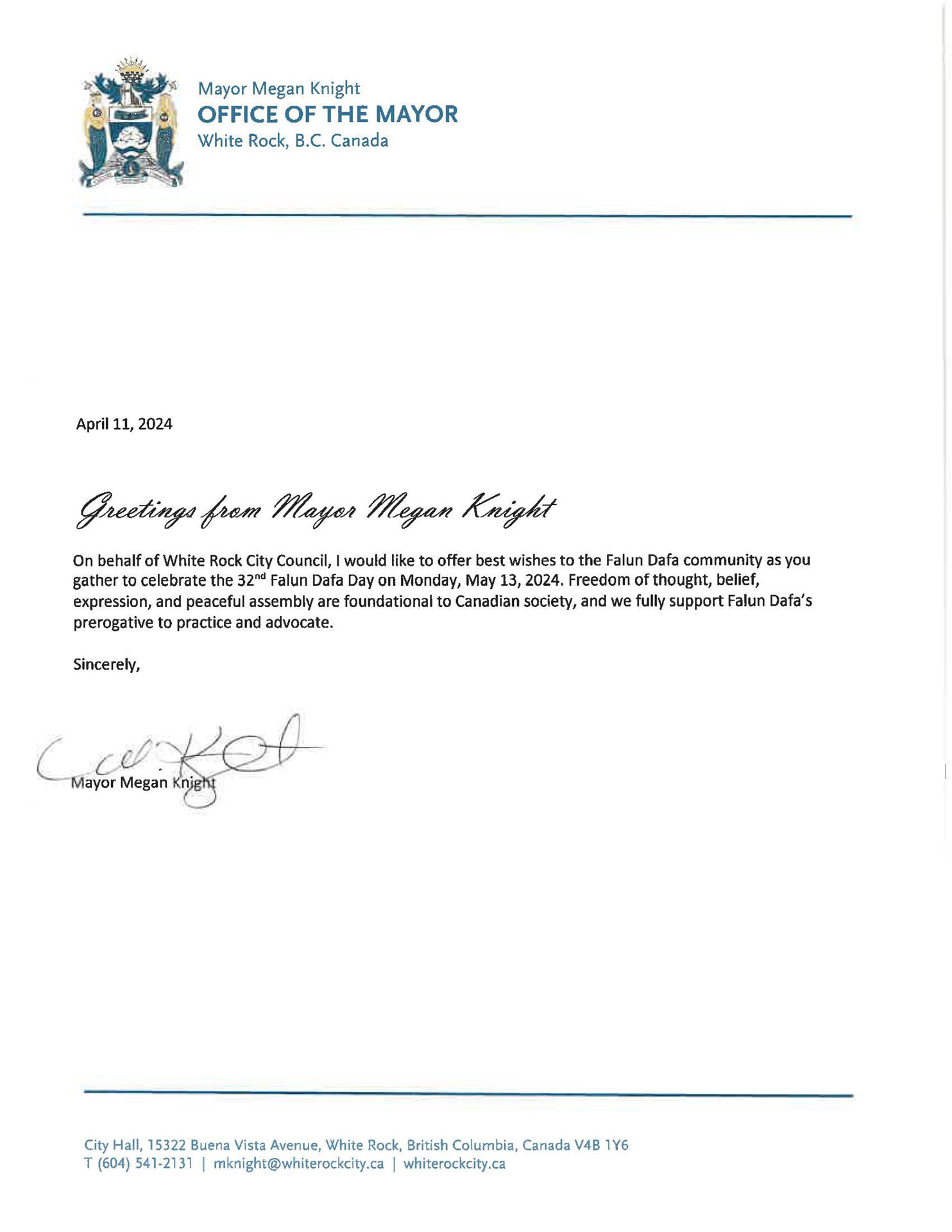 白石鎮市長梅根﹒奈特(Megan Knight)在賀信中寫道:「在你們於二零二四年五月十三日慶祝法輪大法弘傳三十二週年之際,我謹代表白石鎮市議會向法輪大法社區致以最美好的祝願。擁有思想、信仰、表達與平和集會的自由是加拿大社會的基礎,我們完全支持實踐和倡導法輪大法的權利。」