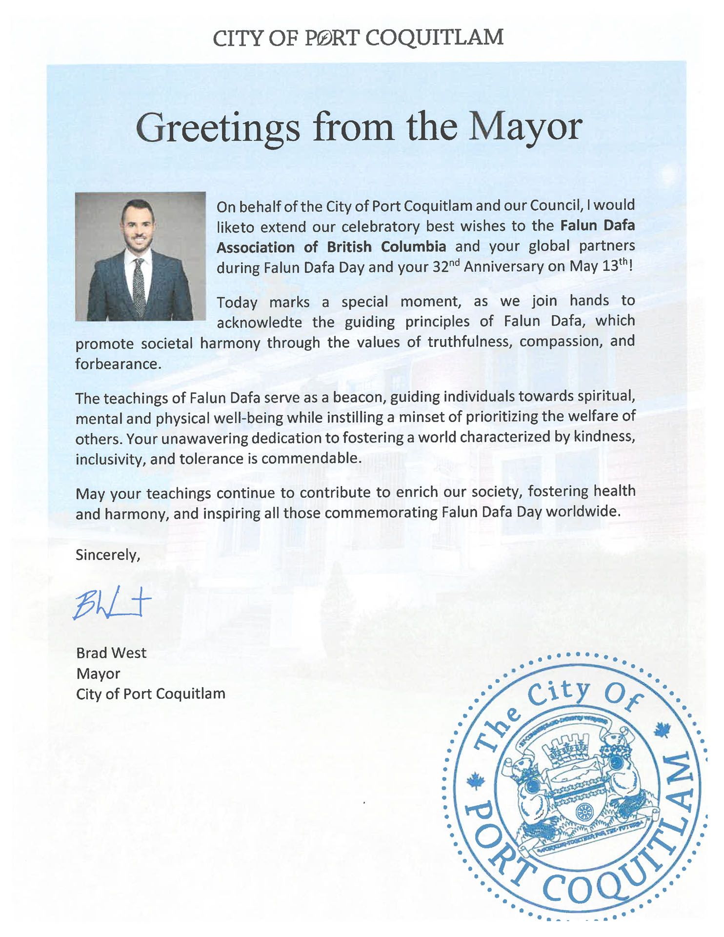 高貴林港市長布拉德﹒韋斯特(Brad West)在賀信中寫道:「值此五月十三日法輪大法日和法輪大法弘傳三十二週年紀念日之際,我謹代表高貴林港市和市議會向卑詩省法輪大法協會和你們全球的同仁致以最美好的祝福!