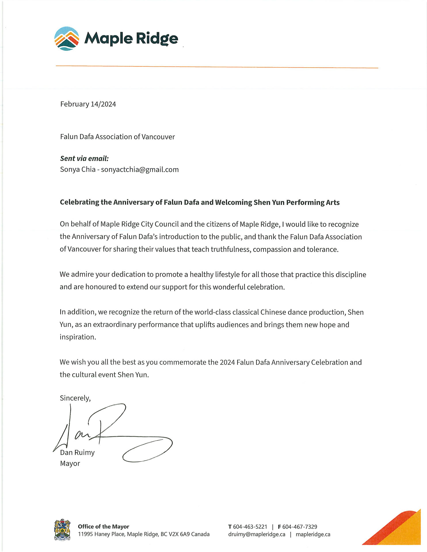 楓樹嶺市市長丹﹒瑞米(Dan Ruimy)在賀信中寫道:「我謹代表楓樹嶺市市政府和全體市民,恭賀法輪大法洪傳三十二週年紀念日,並感謝溫哥華法輪大法協會分享他們的價值觀,教導人們真、善、忍。