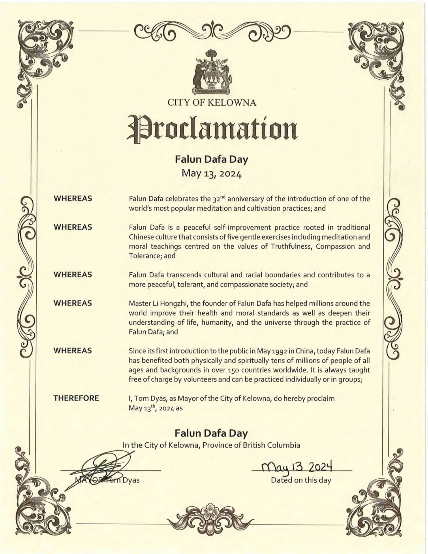 為此,我,Tom Dyas,基隆拿市長在此宣布,二零二四年五月十三日為卑詩省基隆納市法輪大法日。
