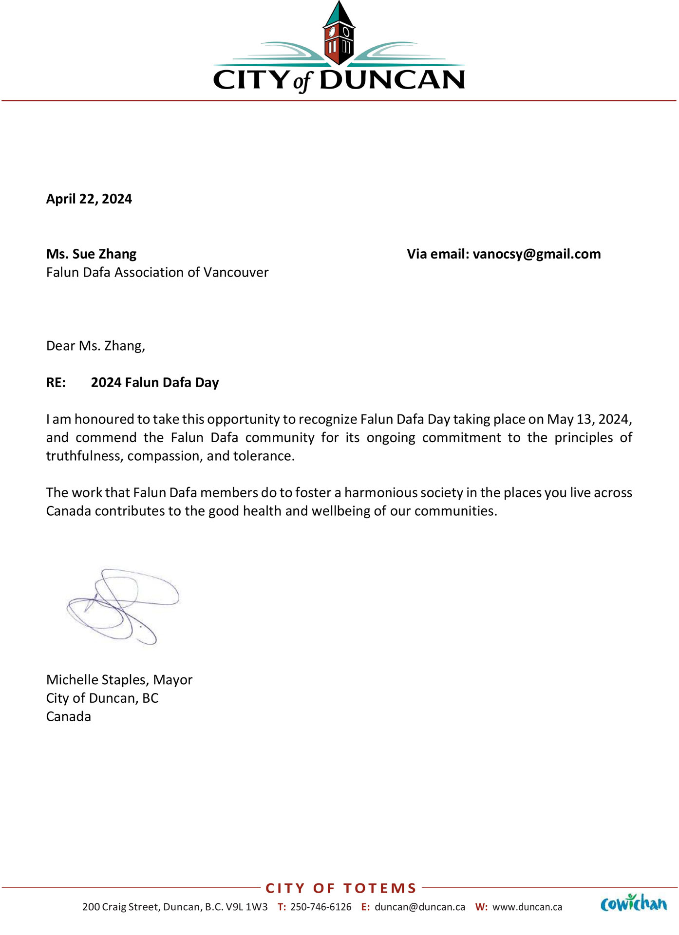 鄧肯市市長米歇爾﹒斯台普斯(Michelle Staples)發來的賀信中說:「我很榮幸借此機會表彰二零二四年五月十三日的法輪大法日,並讚賞法輪大法社區對「真、善、忍」原則堅持不懈的追求與奉獻。