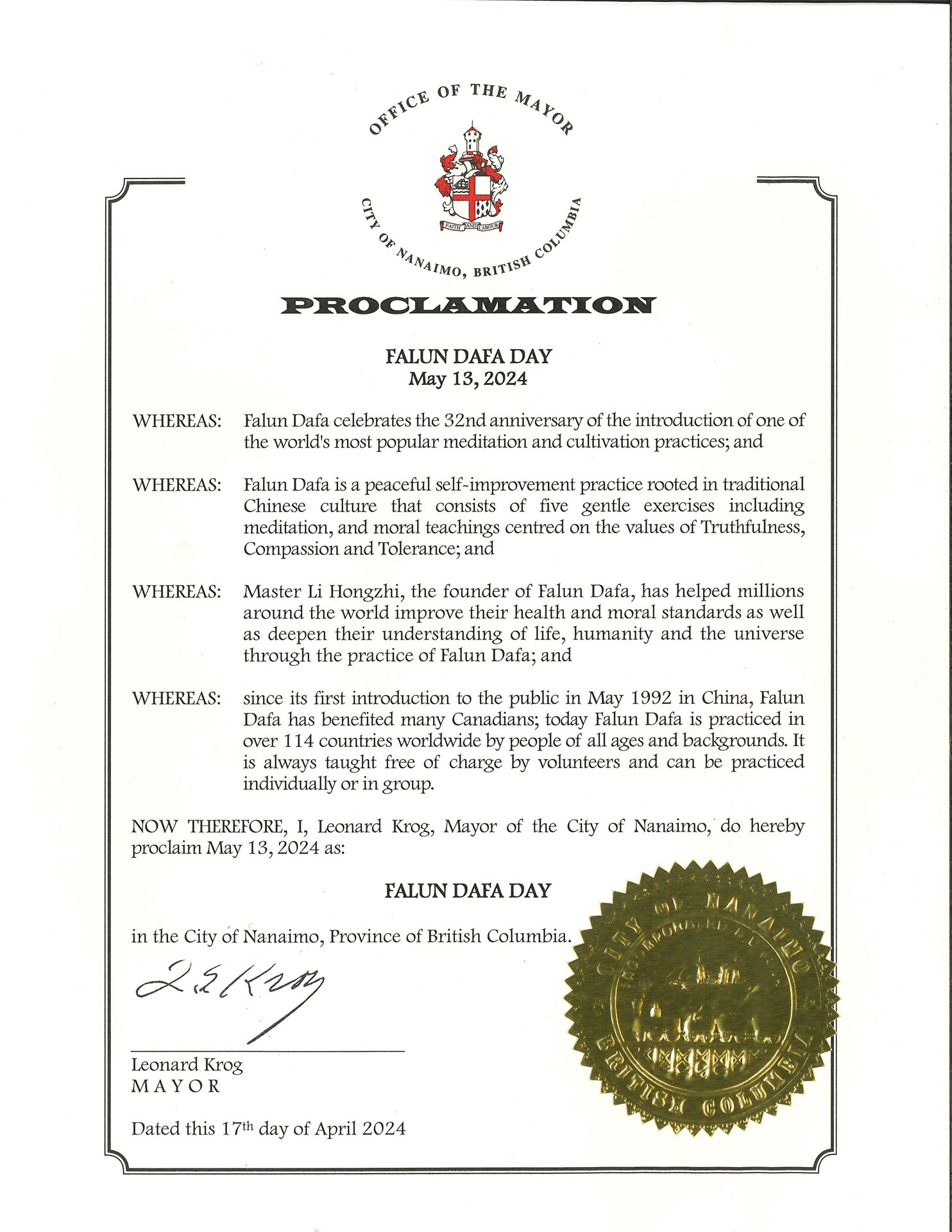為此,我,Leonard Krog,納奈莫市市長在此宣布,二零二四年五月十三日為卑詩省納奈莫市法輪大法日。