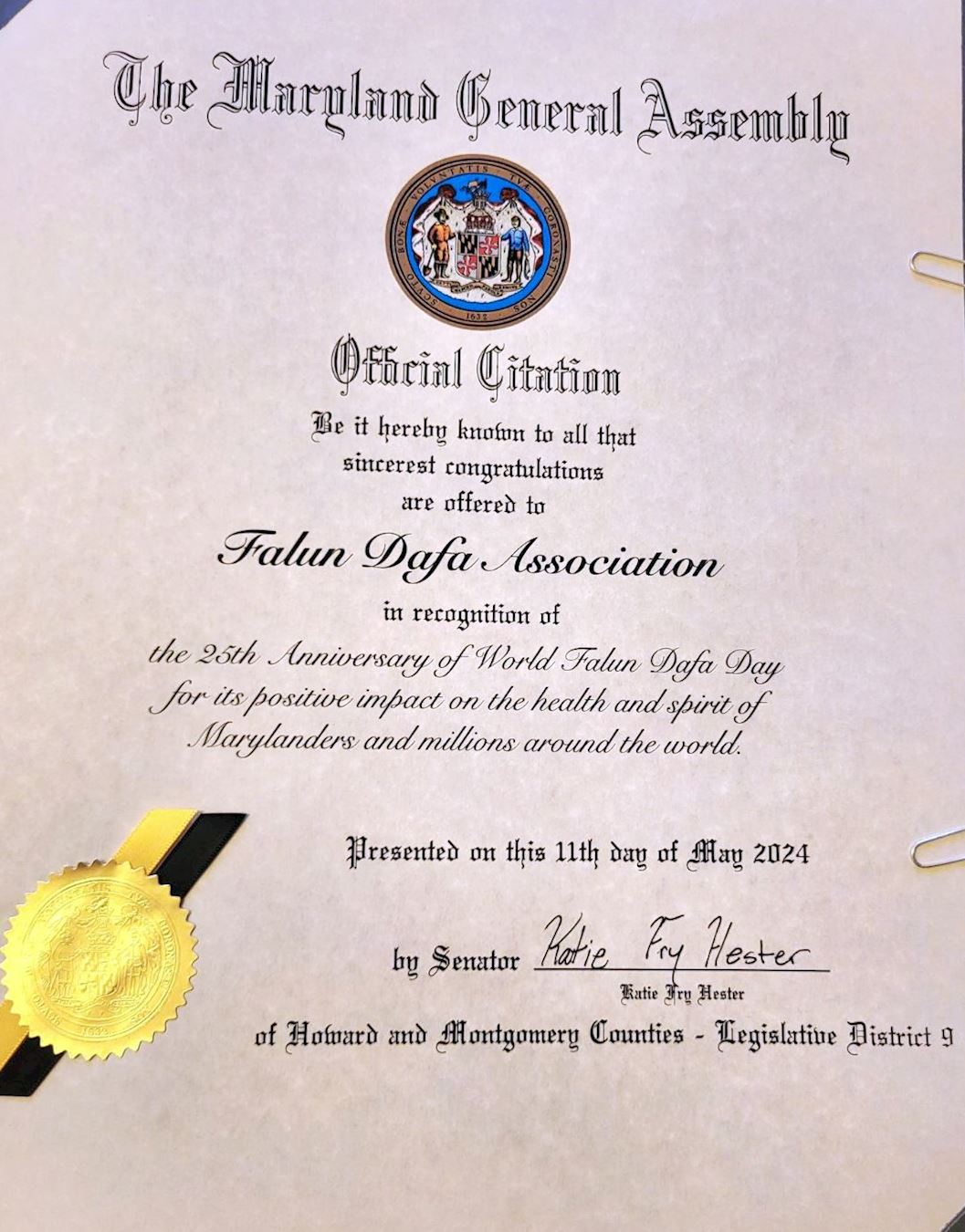 表彰第二十五屆世界法輪大法日,以及法輪大法給馬裏蘭州居民及全世界數百萬人的身心健康帶來正面的影響。